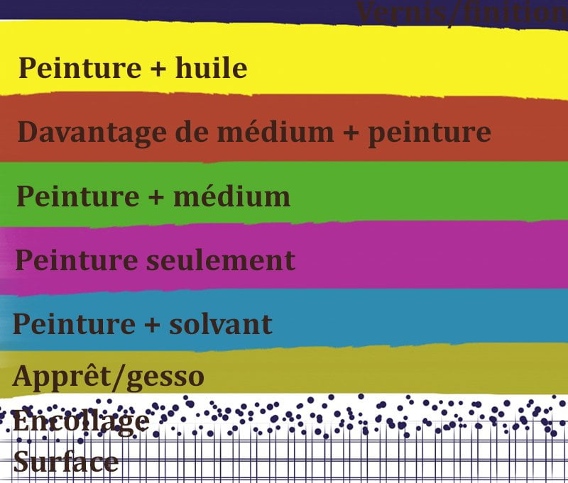 Si on peint une mince couche dénuée de gras (huile) par-dessus une couche plus épaisse qui est en processus de séchage il est probable que la peinture en surface se fissure. Autre problème commun lorsque l’on ne respecte pas ce principe c’est le flétrissement des couleurs.