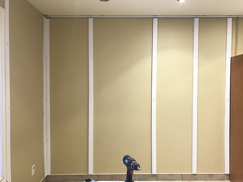 Étape 1 : visser les planches verticalement au mur. Idéalement aux endroits où vous repérez du solide. L’emplacement de ces planches détermine aussi les espaces de clouage nécessaires pour fixer les panneaux perforés et/ ou panneau d’isolation.