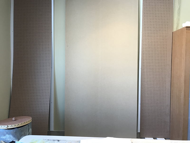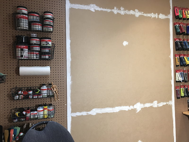 Étape 3 : peindre le panneau central avec un apprêt blanc ou gris pâle; cet espace sera consacré à l’élaboration des œuvres. Il suffira d’agrafer ou suspendre la toile sur cette section.
