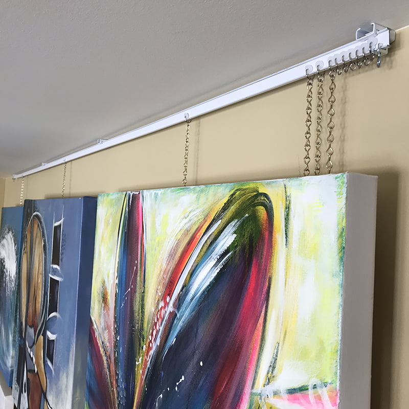 Autre astuce, pour exposer vos créations, des chaînettes fixées sur une tringle coulissante pour rideaux convient très bien et est peu coûteux. Des crochets en forme de ‘‘S’’ seront utiles pour l’accrochage sur ces chaînettes.