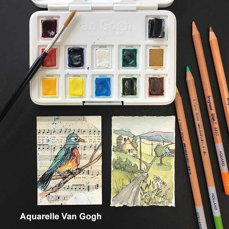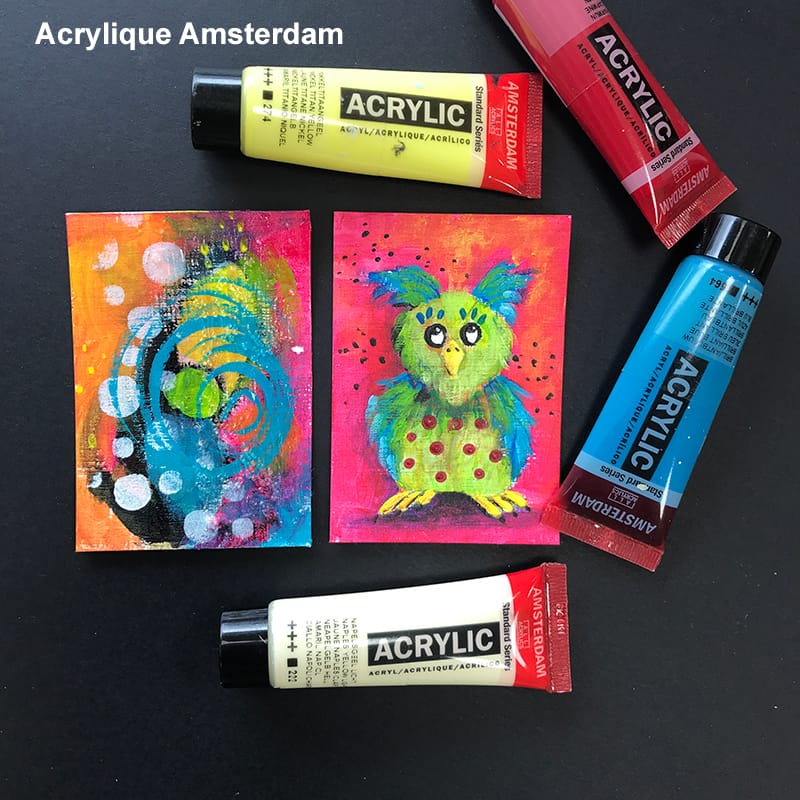 Ci-inclus quelques exemples crées, aquarelle, crayons de couleurs, peinture acrylique, encre, collage, feutres, pastel, technique mixte sont bien entendu les médiums fréquemment utilisés.