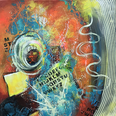 Je peints ces abstractions avec de la peinture acrylique, j’y ajoute parfois de l’empâtement et/ou des collages.