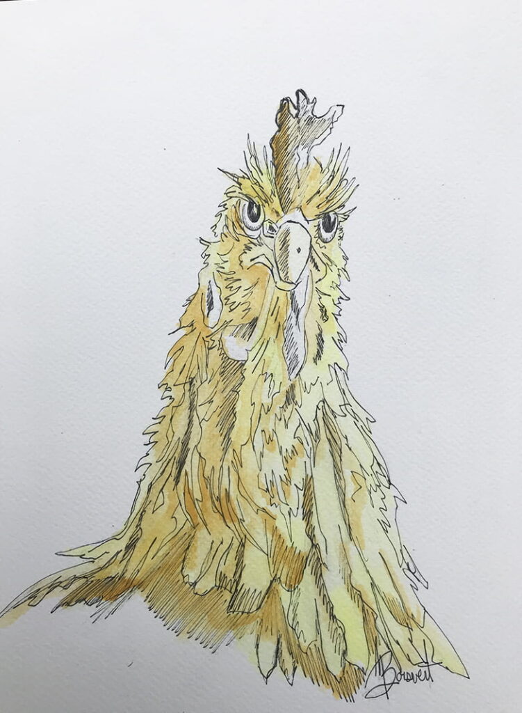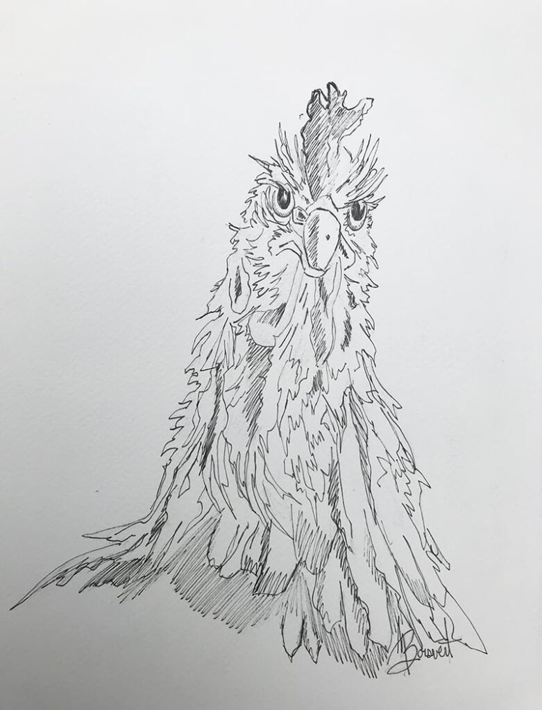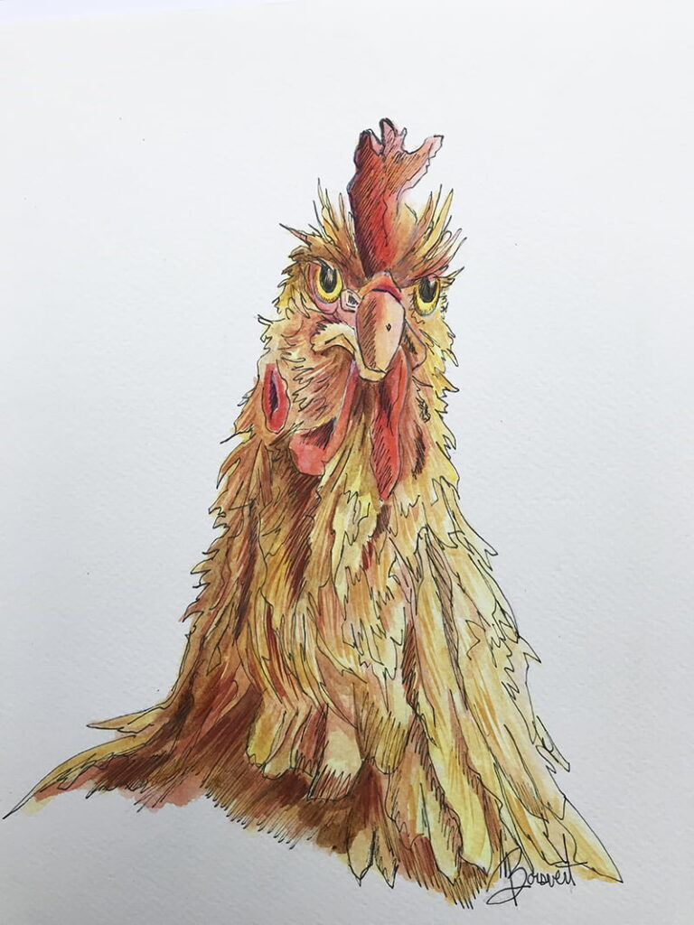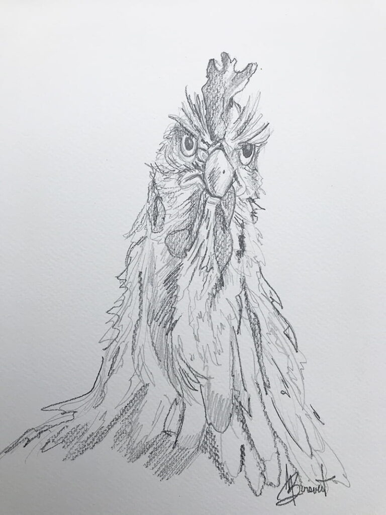 Ici j’ai d’abord dessiné la poule rousse à main levée à l’aide d’un crayon HB, je positionne les ombres, planifie les lumières.