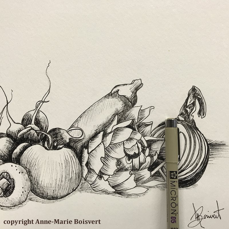 Afin de mettre la technique au goût du jour je propose d’utiliser simplement un crayon Sakura Micron Archival noir 05 ainsi que de la peinture à l’huile Cobra soluble à l’eau accompagné de la pâte à peindre Cobra 087.
