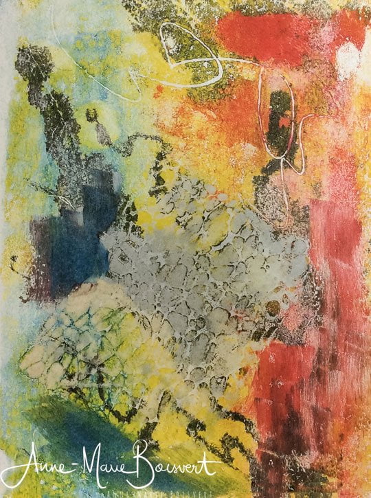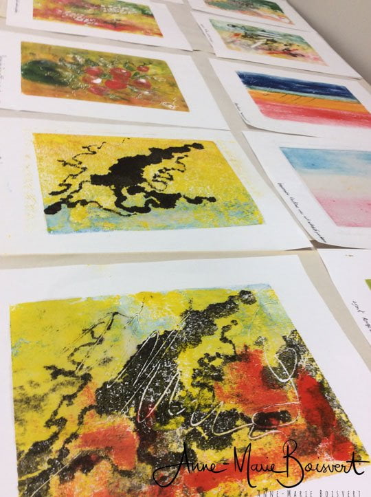 Pour se familiariser avec les encres Akua, nous avons fait plusieurs essaies d’impression monotype à l’aide d’une plaque mince en plexiglas et un rouleau, d’une spatule et/ ou un pinceau.