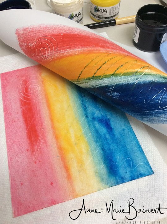 Les encres Akua ne sèchent pas rapidement, ce qui nous laisse tout le temps nécessaire pour créer le motif qui sera imprimé par la suite avec pression sur le papier sec ou mouillé de votre choix.
