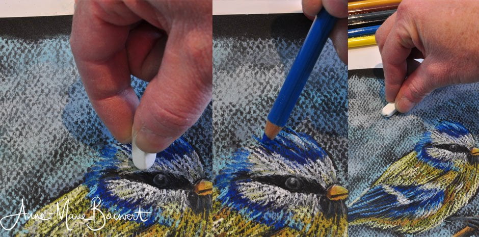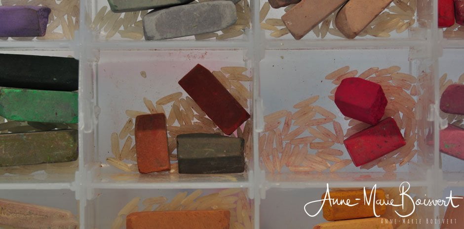 Truc du métier : nettoyer, essuyer les craies pastel sur un chiffon si elles se salissent et/ou entreposez-les dans un contenant avec des compartiments dans lequel on déposera des grains de riz non-cuits.