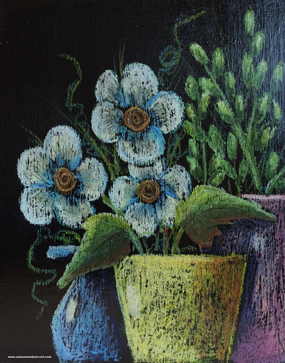 Le pastel à l’huile se travaille sur papier, carton, toile brute, plastique, aluminium, verre, toile traitée au gesso de même que sur les panneaux de bois. Ma surface préférée est sans aucun doute le bois que je scelle généralement avec une ou deux minces couches de gesso blanc ou noir. Il m’arrive aussi de travailler sur du bois non traitée, ce qui me permet de révéler des textures et des nuances en rapport avec le grain de bois.