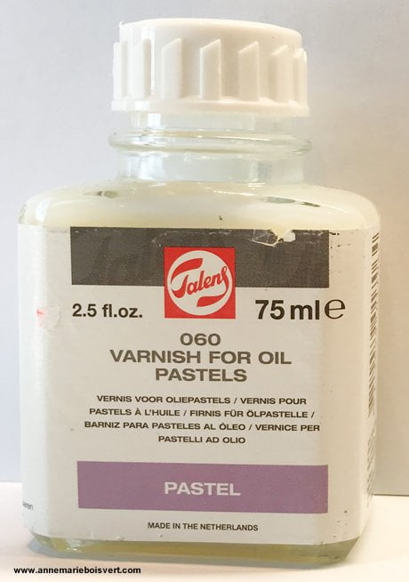 Pour les œuvres faites sur bois je les protège en appliquant délicatement un vernis conçu pour cette tâche. Sennelier en propose un en aérosol et Talens en offre un que l’on applique au pinceau. Ce vernis liquide est très efficace, deux minces couches suffisent pour sceller le pastel. À noter, le fini est lustré.