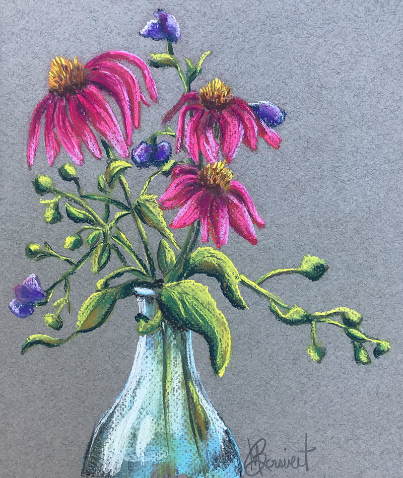 Très tôt dans mon cheminement artistique ce médium m’a conquis, pour son aspect velouté et diffus. On travaille le pastel principalement sur du papier coloré (teinté) conçu pour cette tâche.