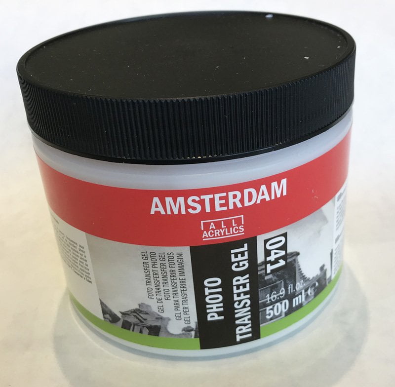 La plupart des médiums acryliques qui deviennent transparent ou semi-transparent conviennent pour faire des transferts. Le médium transfert photo Amsterdam de la compagnie Talens est l’un de celui-là. Je l’ai testé sur plusieurs surfaces et il fonctionne très bien.