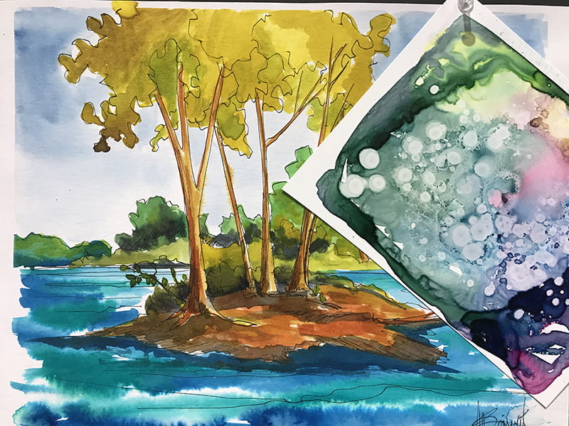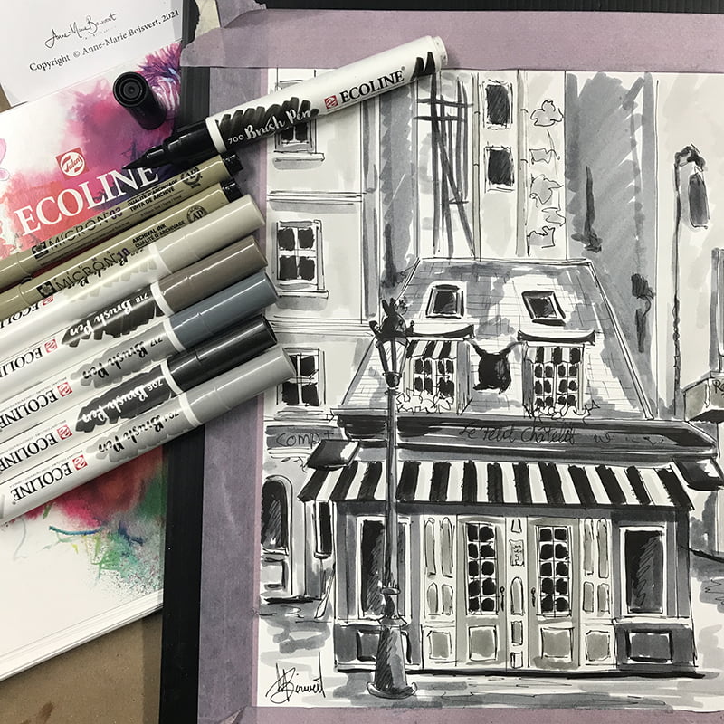 Téchargez un pas à pas d’initiation pour l’aquarelle liquide Ecoline : https://www.annemarieboisvert.com/wp-content/uploads/2020/02/CE-16-crayon-Pigma-micron-sakura-et-Ecoline-Royal-Talens.pdf