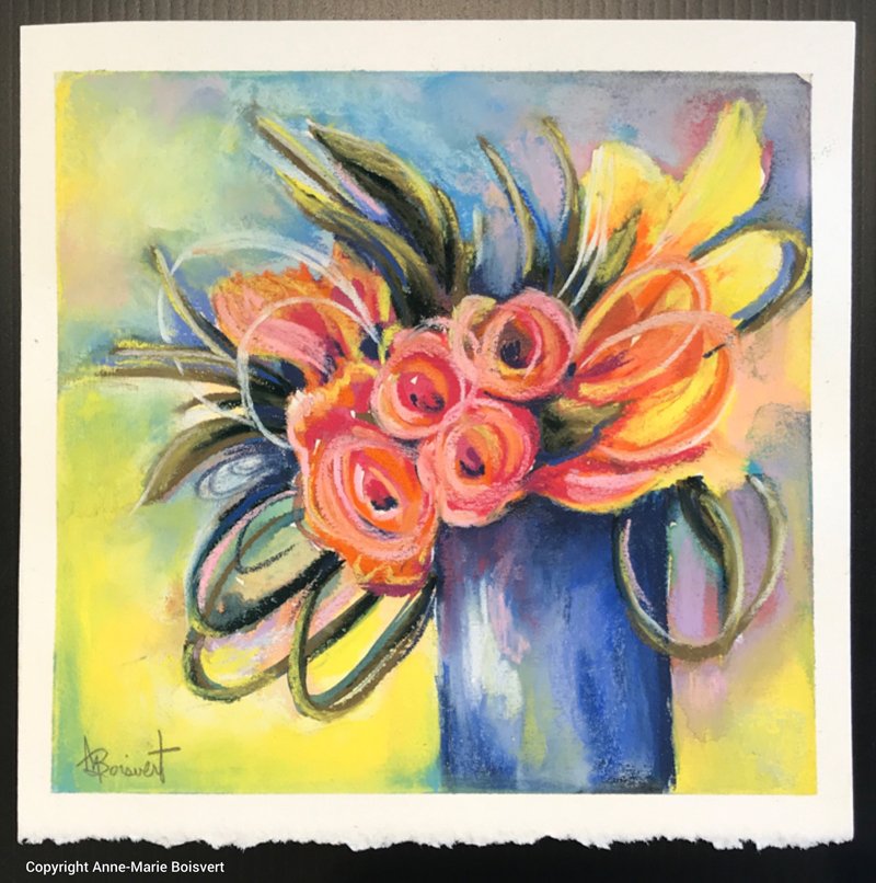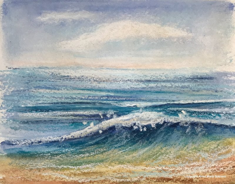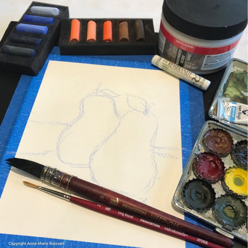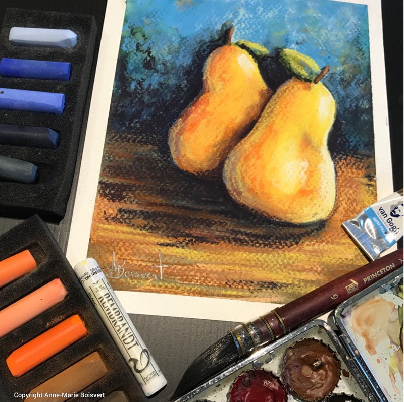 Le papier aquarelle régulier peut être utilisé en le traitant d’abord avec un Gesso transparent ou un médium Pumice pour favoriser l’adhérence du pastel sec qui y sera superposé. Il existe aussi des médiums expressément conçu pour le pastel dans différentes compagnies tel que Golden et Art Spectrum. Ici-bas un exemple sur papier aquarelle au grain fin traitée d’abord avec le Gesso transparent Amsterdam.