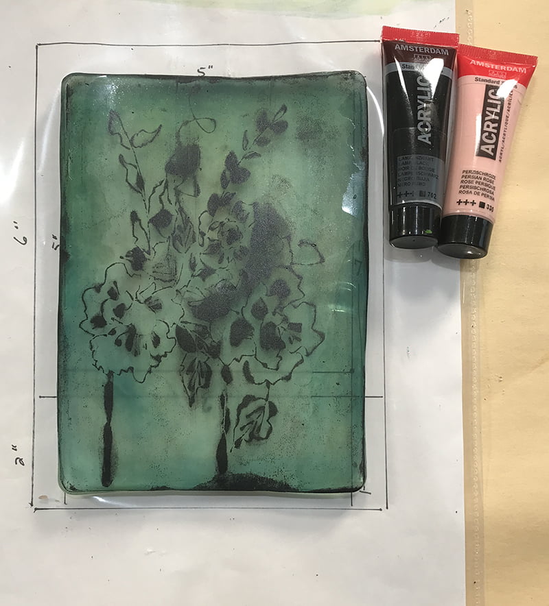 Rouler une couche uniforme de noir sur la plaque gélatine puis déposer et frotter délicatement votre dessin pour reporter celui-ci sur la surface. Vous constaterai que les endroits ‘’gravés’’ laisseront la surface noire puisqu’ elles ne toucheront pas la plaque. Retirer délicatement votre dessin et laisser sécher.