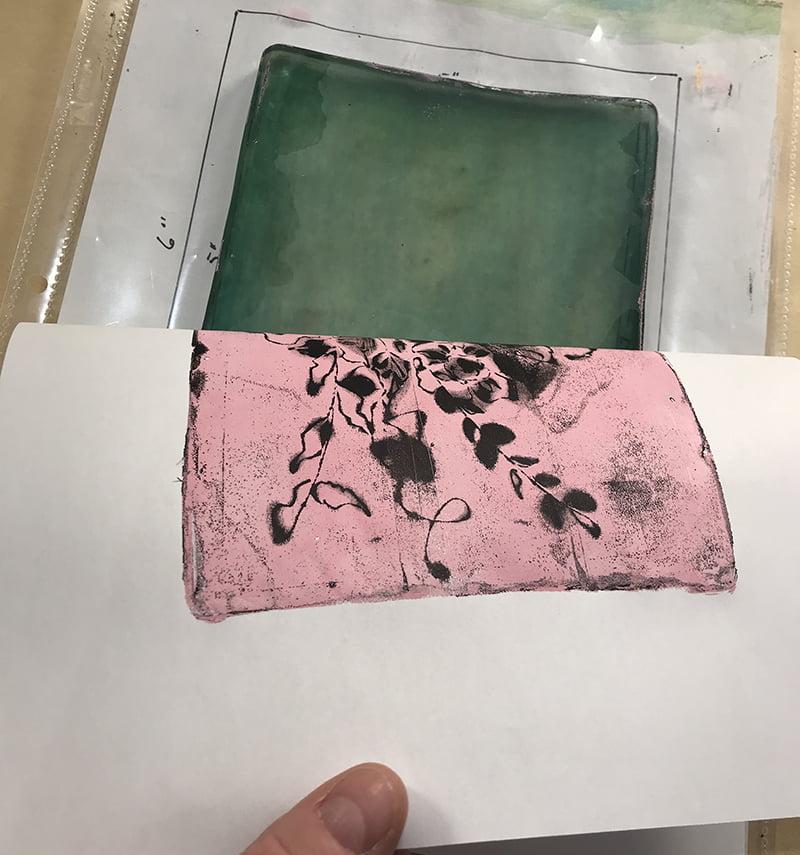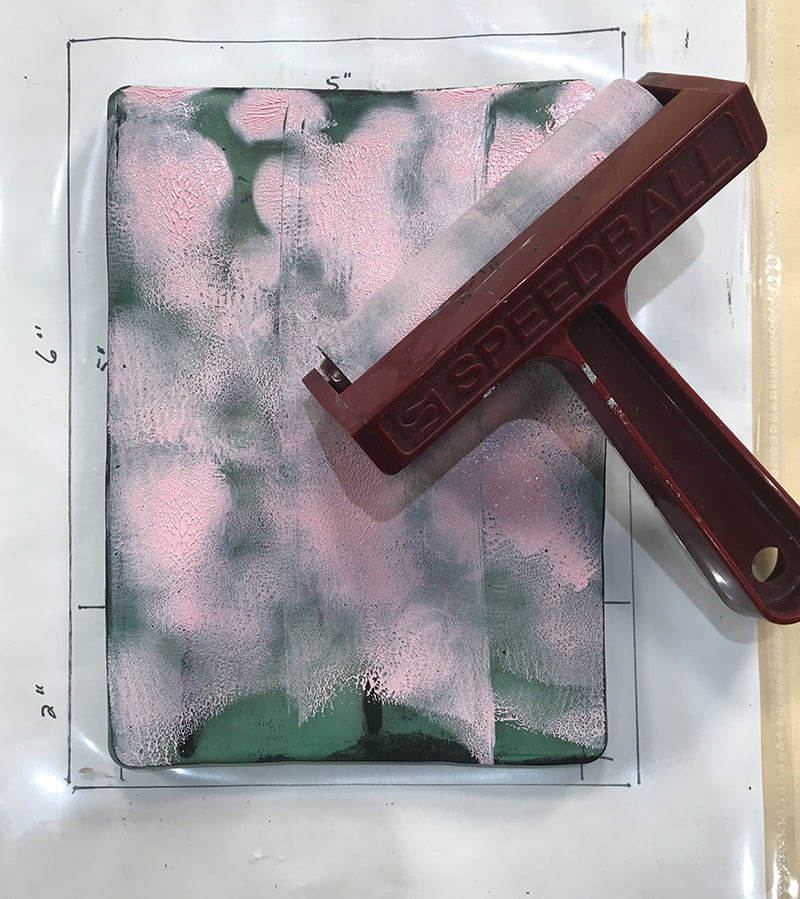 Rouler une couche uniforme de rose sur la plaque gélatine puis déposer et frotter plus fortement votre feuille d’impression pour bien reporter le tout. (voir vidéo). Retirer délicatement votre feuille pour révéler votre monotype.