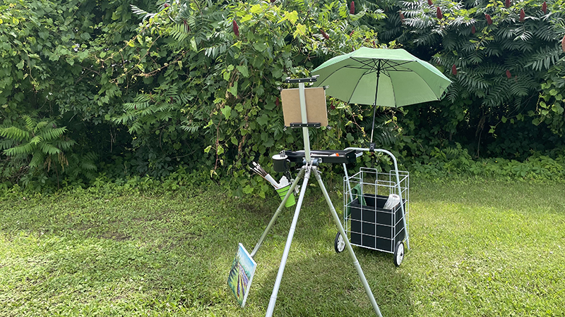 Cette activité artistique apporte son lot d’anecdotes, comme découvrir un nid de fourmis sous sa chaise, importer des insectes dans son sac à dos déposé sur le sol ou affronter de solides vents qui finissent par happer ton chevalet qui tombe ensuite au sol dans la boue.