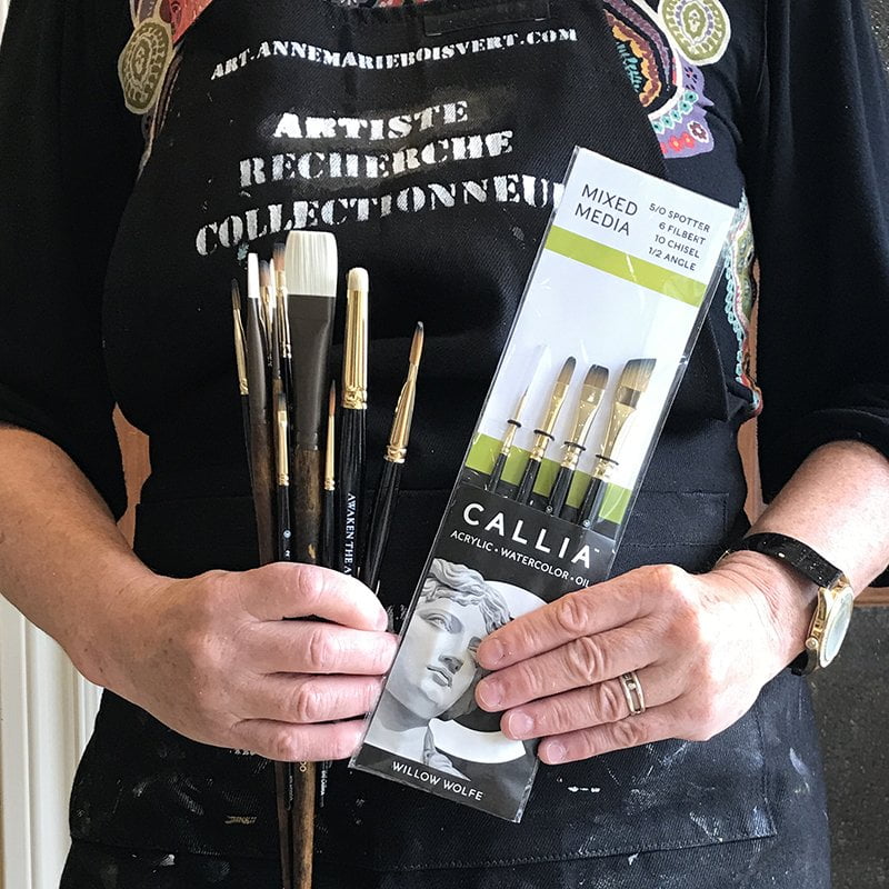 La gamme de pinceaux Callia est conçue principalement pour les artistes en technique mixte, je les recommande pour bon nombre de médium et technique confondues. Ils sont plus doux et souples, ils conviennent davantage aux travaux plus minutieux.